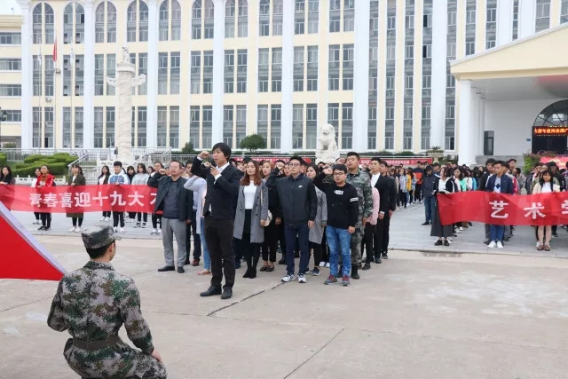 10月18日早上,艺术设计学院在主教楼前举行了“青春喜迎十九大,不忘初心跟党走”升旗仪式,同学们在五星红旗下相聚,以最饱满的状态喜迎十九大胜利召开。艺术设计学院党总支书记陈翠娥、副院长付凌云、学工办主任张思敏、全体辅导员、学生党员及近千名学生参加了升旗仪式。