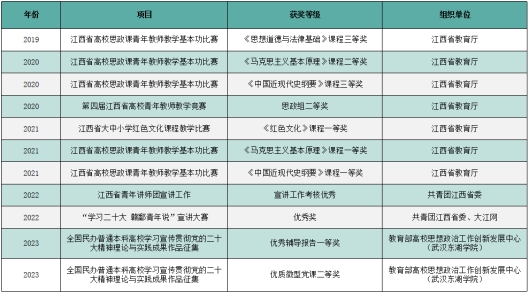 4.着力打造典型人物。学校重视思政课教师队伍培养,为青年教师配备导师,坚持“赛训结合”,打造教研团队,充分调动全社会力量和资源,建好“大师资”。思政课教师荣获江西省高校思政课青年教师教学基本功比赛一等奖4项、二等奖2项、三等奖6项,江西省青年教师教学竞赛二等奖1项等。组建思政课教师宣讲团,2人入选江西省青年讲师团、江西省思政课教师宣讲团成员,1人荣获江西省共青团宣传工作考核优秀,多位教师荣获校级优秀共产党员、优秀党务工作者、“三育人”标兵、“抗疫先进个人”等称号。
