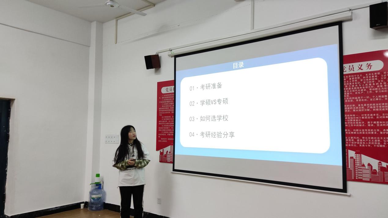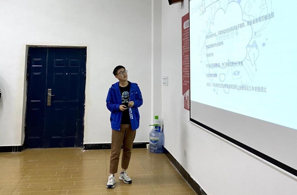 17服工本科3班梁宵向同学们介绍了学硕和专硕的区别,她建议同学们可以有针对性的选择自己所适合的专业进行报考。她还向同学们介绍了面试中的相关技巧,以及在备考期间每日坚持手绘、利用学校广播提高英语口语、坚持有效的刷题等学习方法。她突出介绍了心理及身体健康的重要性,帮助同学们深刻认识到考研的时间安排和高效都需要依靠健康来支撑.