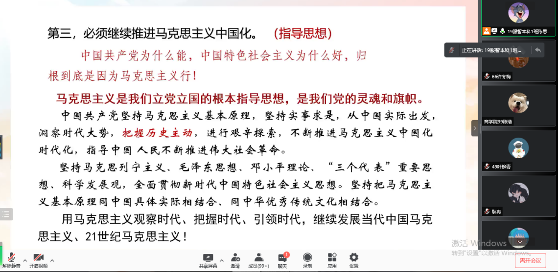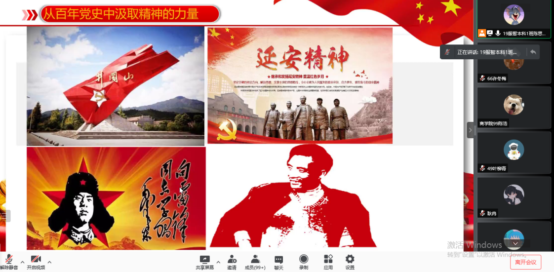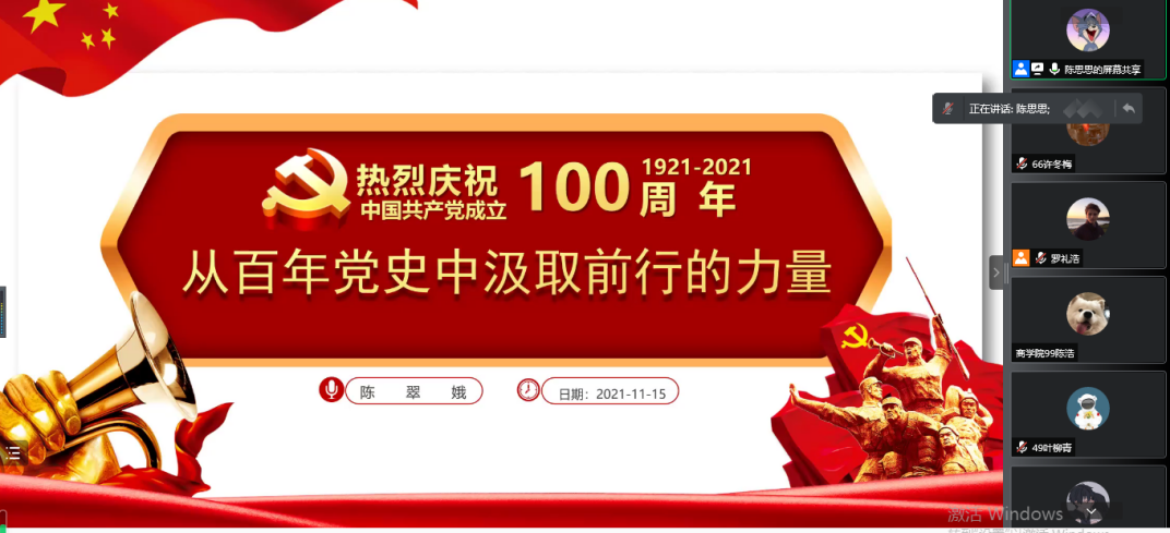 为深入贯彻学习党的十九届六中全会精神,回顾中国共产党百年奋斗的光辉历程,引导入党积极分子加强党史学习教育,将“学党史,强信念,跟党走”的发展理念走深走实,2021年11月15日晚7点,商学院第三十二期入党积极分子培训第六讲——《从党的历史中汲取前行的力量》通过腾讯会议的方式开展,此次培训的主讲人为校党委组织部部长陈翠娥同志。