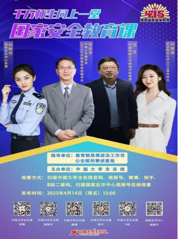 为深入学习贯彻习近平新时代中国特色社会主义思想,进一步提高全校师生国家安全意识,营造维护国家安全的浓厚氛围,增强防范和抵御安全风险能力。时尚传媒学院结合实际,围绕主题深入开展活动。2023年4月14日下午15:00时尚传媒学院组织师生线上观看以“千万师生同上一堂国家安全教育课”为主题的公开课。由中国传媒大学新闻学院教授沈浩,2019年全国最美高校辅导员、中南大学辅导员张金学,国家反诈中心民警刘明竹,北京师范大学2019级本科生刘懿莹联合为全国师生讲授。
