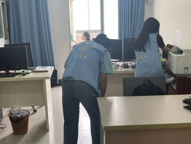 在798实训室的志愿者主要是负责清理各个座位抽屉、地板上的垃圾;保持讲台、黑板及桌面的干净;整齐摆放课桌等等。在商学院办公室的志愿者主要清洁打扫走廊过道的垃圾浮尘、办公室的桌面地面以及档案柜,以此保证办公室和走廊的干净整洁。两组成员共同行动,助力提升校容校貌,美化校园环境,让一朵朵文明之花在“江服”各处绽放。