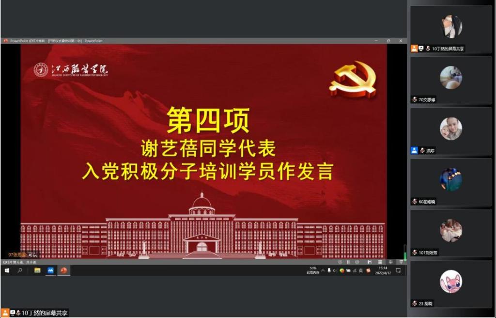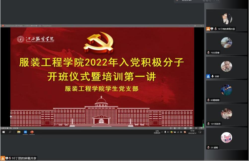服装工程学院讯(撰稿:邓美伶)4月12日下午3:00时,服装工程学院以线上会议形式举行了2022年第一期入党积极分子培训班开班仪式暨培训课第一讲。学院党总支书记彭波,学生党支部组织委员蔡燕萍,学生党支部委员孟百川、李静雯、冯秀秀以及115名培训班学员参加了开班仪式,开班仪式由学生党支部书记洪婷主持。