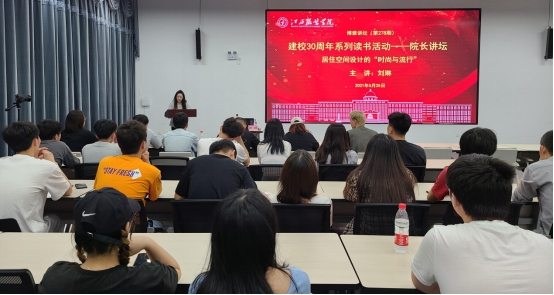 5月25日下午,图书馆、科研处在图书馆三楼学术报告厅举办“建校30周年系列读书活动”——院长讲坛第一场。艺术设计学院院长刘琳为艺术设计等学院120余名学生带来一场题为《居住空间设计的“时尚与流行”》的报告。本次讲坛由图书馆副馆长邓丽霞主持。