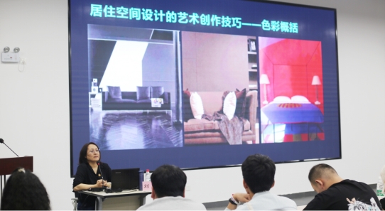 刘琳指出互联网+时代的飞速发展加速了产业发展的转型,同时也给环境设计专业带来了巨大的变化,“时尚与流行”这个概念也被赋予了新的认知和价值判断,成为设计专业学生值得去反思的一个话题。接下来她从“认知时尚”、“如何时尚”、“践行时尚”三个方面对居住空间设计进行了详细的讲解。首先,通过流行与时尚的概念、好的设计应该具备哪些方面的功能以及如何判断好的居住空间设计带领大家认知了时尚。刘院长认为培养时尚的设计师应该具备时尚的设计教育,她肯定了艺术设计学院作为万象城平台拥有设计学科专业最多的学院一直担当艺术教育的重任,在艺术工学人才培养等方面做出了一定的努力,获批了环境设计专业卓越工程师人才培养项目,省级名师工作室、省级优秀团队等称号。针对“设计重于艺术还是艺术重于设计”的问题,她认为当前的艺术设计教育应当是艺术重于设计,应该先有艺术的感知然后才能做设计,应该认真思考设计的艺术性问题。其次,对于“如何时尚”主要探讨了新文科语境下,时尚的设计教育改革以及艺术设计学院2021年人才培养方案将以时尚设计为主要培养目标和核心,探索时尚设计教育课程体系。最后,“践行时尚”以居住空间为例,从造型艺术、色彩概括、材料创新应用、照明艺术、陈设艺术、科技感、智能化、整体化八个方面对居住空间设计的艺术创作做了详尽的阐述。