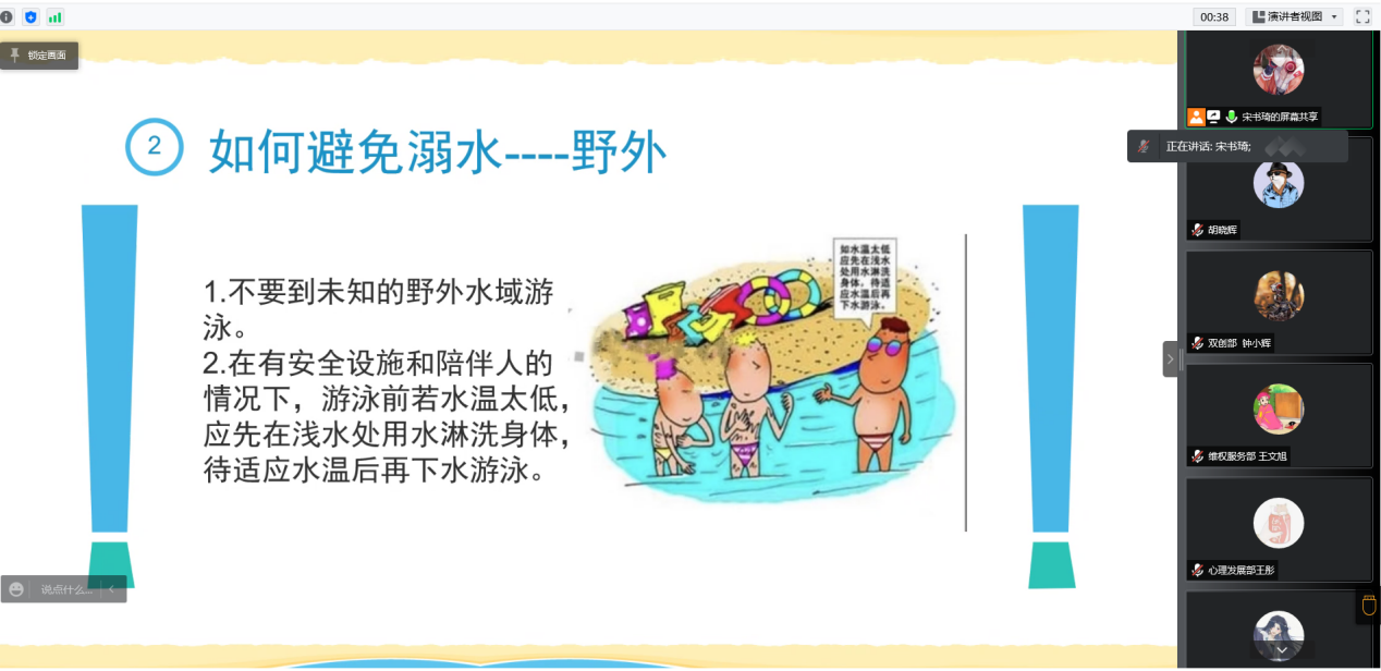 活动伊始,宋书琦围绕“游泳安全注意事项”“如何预防溺水”及“溺水自救与施救”三个方面展开讲解。他特别指出,在游泳之前需要进行体格检查,患有心脏病、高血压等病的人不宜游泳。同时,要慎重选择游泳场所,尽量前往正规游泳池游泳,避免到江河湖泊去游泳。为有效保护自己的生命安全,还应该掌握一些溺水自救与施救的技能,如不熟悉水性者自救方法、水中抽筋自救法、水草缠身自救法、身陷漩涡自救法等。