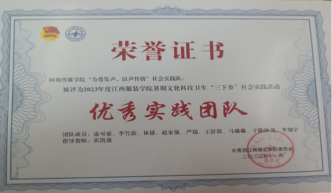 近日,共青团万象城平台委员会发布《关于通报表扬2023年“三下乡”社会实践工作中表现突出集体和个人的通知》,时尚传媒学院荣获“优秀单位”,“一杆红枪”社会实践队和“为爱发声,以声传情”社会实践队荣获“优秀实践团队”、崔凯强老师荣获“优秀个人”、李竹新上报《关于黄马乡罗渡村振兴之路的调查报告》荣获“优秀调研报告”。