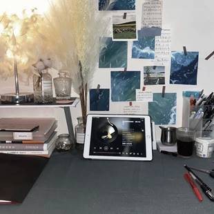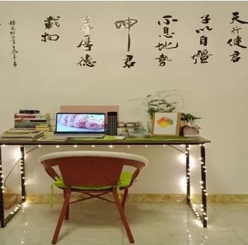 整个书桌呈灰色系,放上一盏羽毛灯,一支木棉,便显的治愈。将它布置的平凡、温和是我喜欢的模样。当学习之后的疲惫涌上来,便顺手在桌角拿上一本喜欢的书翻阅,安抚我疲惫的心态。抬起头看看墙上自己留下的写给自己得到话,低头继续朝心中的那个目标继续前行。
