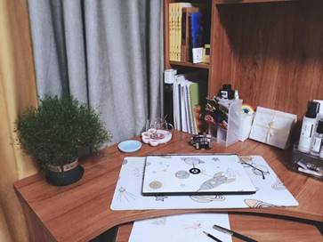 书桌是我们每个人停留时间最长的地方,也是学习、休息和娱乐的一暇天地。我的这一隅之地,既井井有条的堆满课本,也满满当当的摆满了小物件。每天我都在自己温馨雅致的书桌时前进行线上网课学习,当在为绘图时灵感枯竭而抓耳挠腮不知从何下笔时,看到自己书架上整齐有序的书籍时也感到份外的安心。