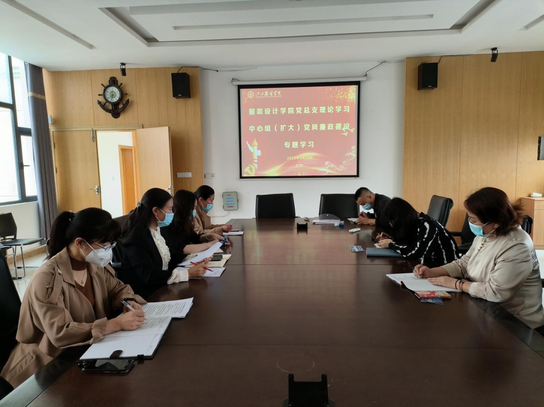 5月23日下午,服装设计学院于清源1栋四楼学院会议室召开2022年第七次党总支理论中心组(扩大)学习会,开展党风廉政建设专题学习。党总支理论中心组成员及学院领导班子出席会议。