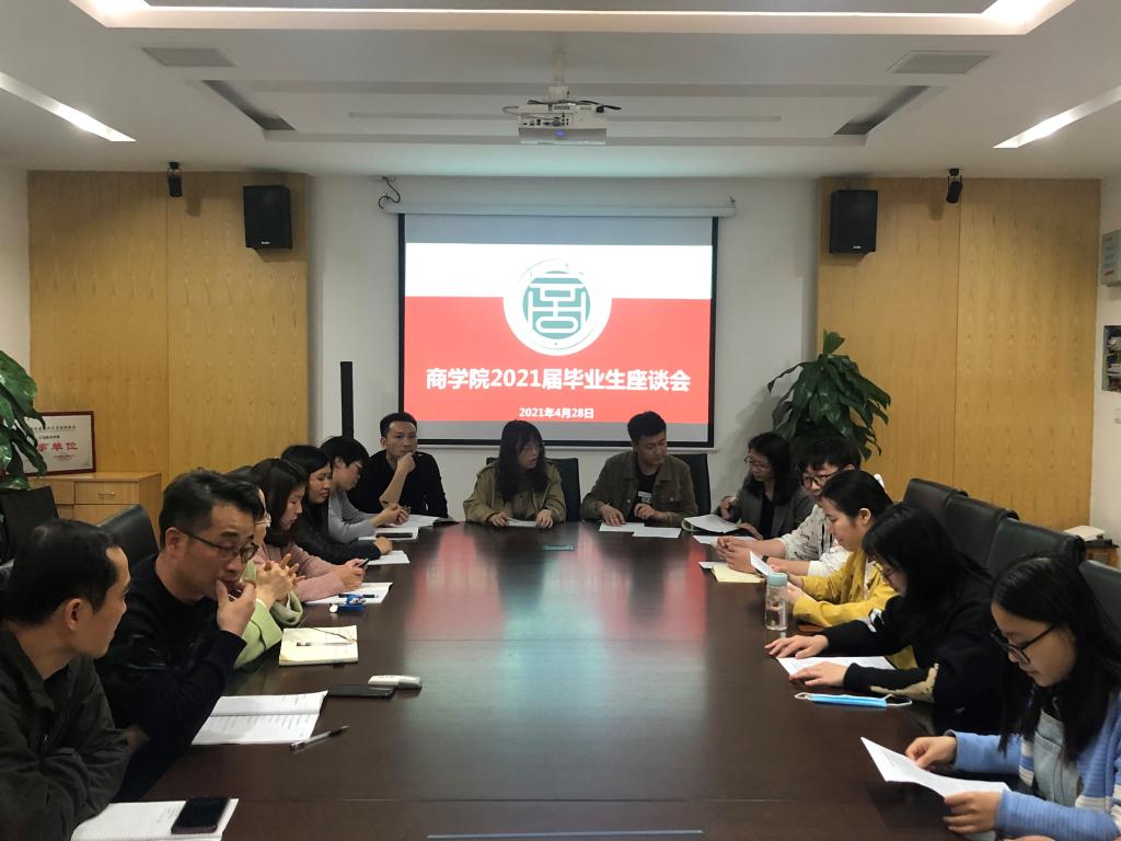 【商学院 讯】 4月28日中午,商学院在商学院三楼会议室组织召开2021届毕业生座谈会。院长谭兆国、书记黄晶磊、副院长罗芳、副院长刘春生、各教研室主任、毕业专业负责人及年级辅导员,各专业毕业生代表参加此次座谈会,会议由刘春生主持。