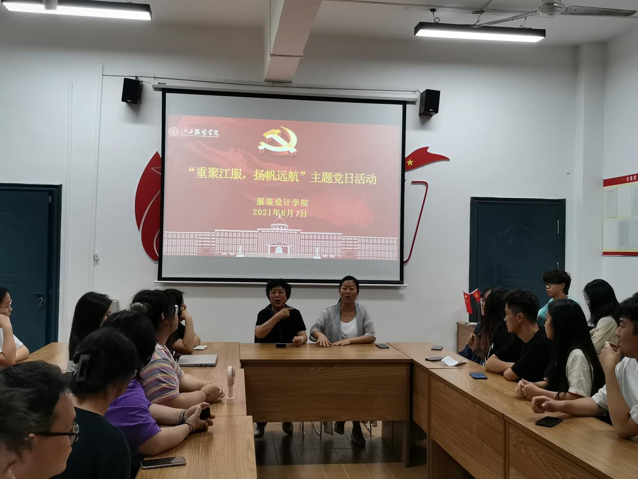 在建党100周年来临之际,在我校2021届毕业生即将离开母校、踏上人生新征程之时,6月7日晚,服装设计学院在清河九栋104活动室开展了2021届毕业生“重聚江服,扬帆远航”主题党日活动,学院学生党支部书记张敬玲、辅导员赵万珍及部分毕业生党员代表参了党日活动。