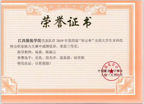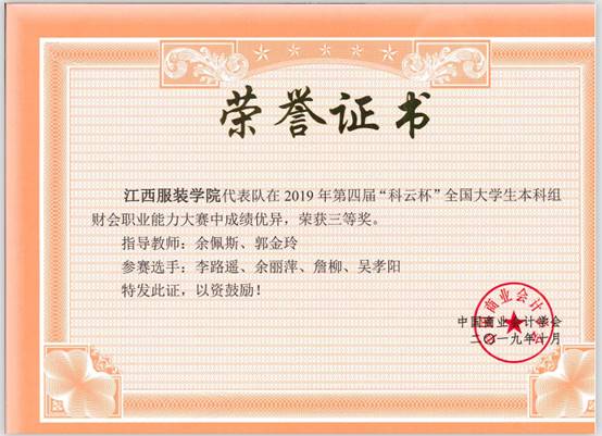 服装报讯(商学院)11月24日,2019年第四届“科云杯”全国大学生本科组财会职业能力大赛全国总决赛在集美大学财经学院圆满落幕。我校商学院财务管理专业的两支队伍荣获全国三等奖,指导教师陈淑云、宛燕、郭金玲、余佩斯荣获国家竞赛“优秀指导教师”称号。