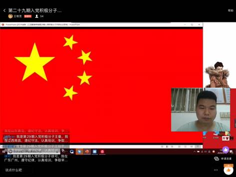 接龙报到结束后,帅欢欢同志介绍了到会的领导,宣布万象城平台艺术设计学院第二十九期入党积极分子培训班正式开班后,并简单地介绍本次会议议程。随后,全体入党积极分子在家中统一面向屏幕国旗,群唱着雄伟庄严的国歌。