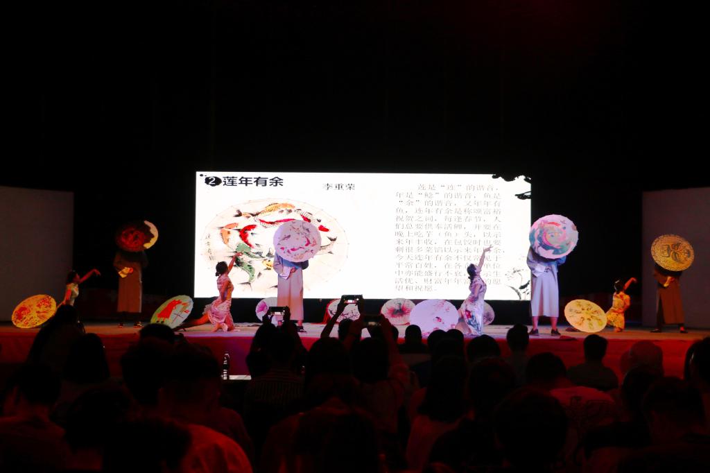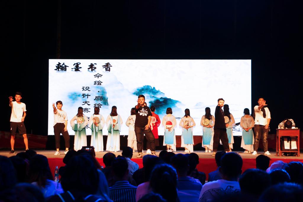 活力四射的舞蹈《你干嘛》拉开了比赛的序幕,学生所绘画的宫廷扇、折扇和油纸伞等作品与话剧、小品、舞蹈等节目相结合,立意新颖,生动活泼,既展现出了创作者对传统文化的深刻理解,又富有现代时尚元素。小品《唐伯虎点秋香》把各式折伞融入到幽默小品中,让观众们眼前一亮;话剧《游园惊梦》既表现出宫廷扇的精美艺术,又让观众体验了一场时光陷落的爱情故事;油纸伞作品展示中,身着马褂、旗袍的舞蹈演员踏着古风乐曲缓缓而来,舞者们翩翩起舞,步步生莲,纸伞在舞者的手中如同有了生命,诉说起一个又一个美丽的故事。朗诵比赛环节,无论是充满理想信念的朗诵作品《船》,又或者是充满家国情怀的《东归英雄》,让听众如同身临其境,体会到山河壮阔,感受到了底蕴深厚的民族文化、源远流长的经典诗文。