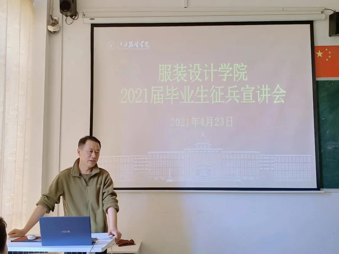 为加强服装设计学院大学生对应征入伍政策的了解,进一步激发广大同学的参军热情,4月23日下午,服装设计学院在主教学楼328教室召开了2021届毕业生征兵宣讲会。院党总支书记彭波、副书记周洪英,学工办主任张敬玲、全体辅导员以及部分毕业班男同学参加了宣讲会,宣讲会由军事体育教学部副主任鲍鹏主讲。