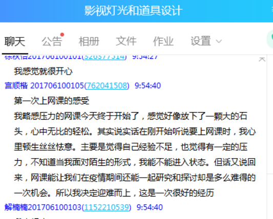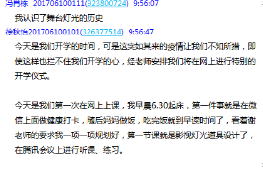 表演与造型教研室邓铭予老师上课感受:今天是新学期的第一次课,特殊时期对于特殊教学方式的经历让我又学会很多。由于疫情的原因,我和班级学生进行线上教学,教师和学生通过互联网进行实时联通,很多传统的教学手段无法实行,但前期充实的准备工作让我有了很多线上教学的新方法和新手段。四节课的实际教学过程结束,我个人感觉教学效果不次于传统的课堂教学。在线上平台,通过随机点名的方式时刻确认学生的上课状态,并通过在线抢答、话题讨论等环节激发学生们对于课程内容的兴趣。通过这次实际的线上教学,我个人对于这种新型的授课方式充满信心,这是一种对于教育的创新和改革,需要更加充分的发展与不断的完善。