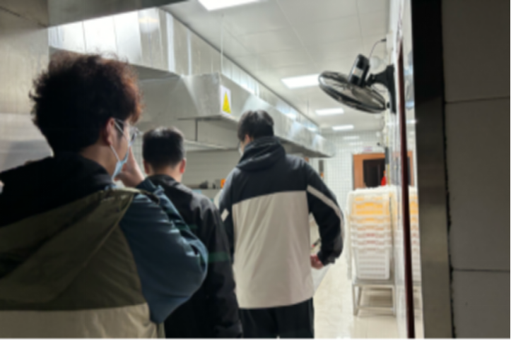 在对食堂的卫生检查中,他们分开行动,在进行简单的人员分配后,开始了对食堂的突击检查。对于这次检查,食堂内部并不知晓,所以这次的检查更能够展现日常工作的卫生环境,展现出食堂内部本来的卫生情况,他们对此都一一记录下来。并督促食堂的工作人员保持良好食堂的卫生环境。