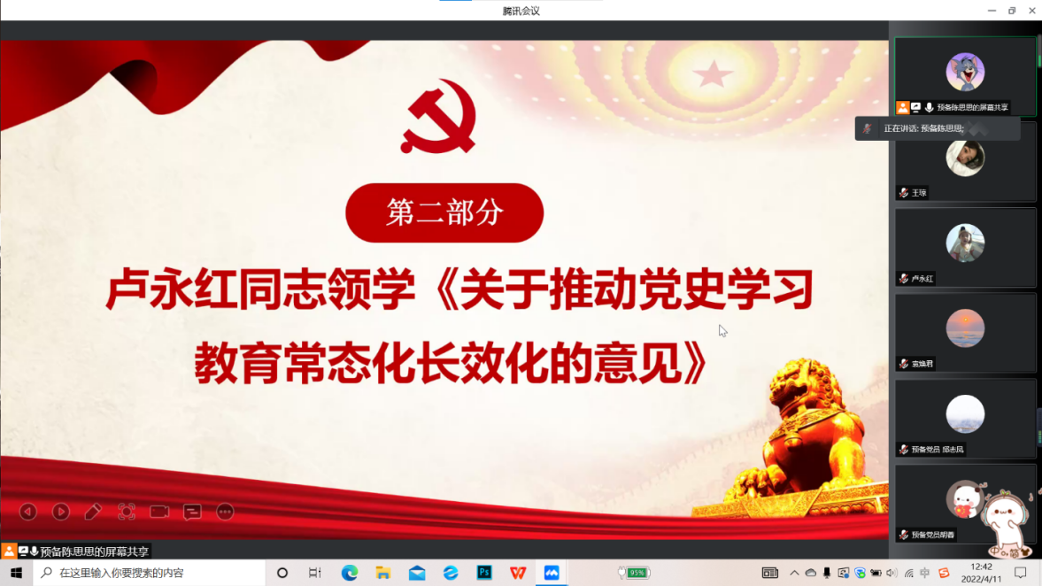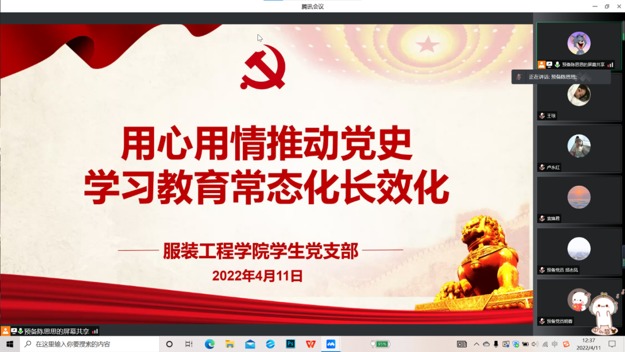 服装工程学院讯(撰稿:谢艺蓓)为进一步深入学习贯彻习近平新时代中国特色社会主义思想和党的十九届六中全会精神,巩固党史学习教育成果,4月11日中午,服装工程学院学生党支部通过腾讯会议组织开展了“用心用情推动党史学习教育常态化长效化”主题党日活动,学生党支部全体党员、预备党员参加了活动,会议由陈思思主持。