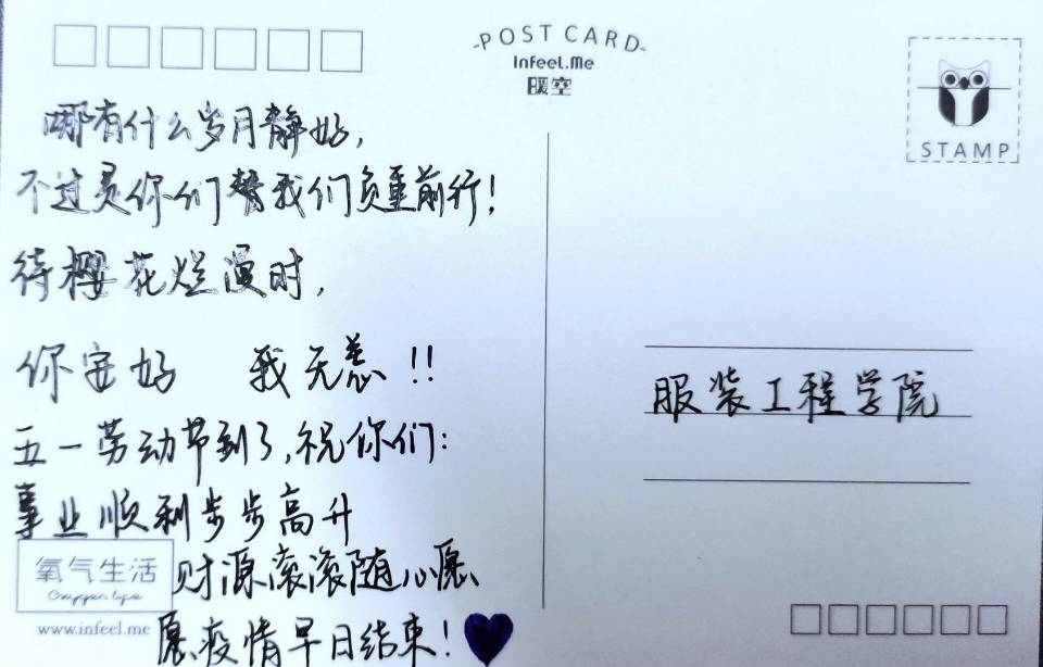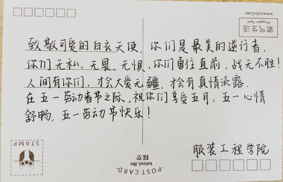 在“五一”国际劳动节期间,服装工程学院的学子们为依然坚守岗位,挥洒汗水的劳动者送上最诚挚的祝福与问候,向劳动者致敬!