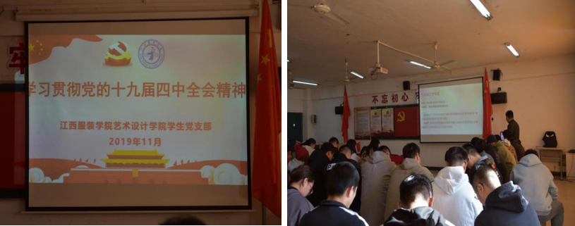 为学习贯彻党的十九届四中全会精神,深入推进“不忘初心,牢记使命”主题教育,进一步加强支部党员理论学习,艺术设计学院学生党支部于11月19日下午在艺术楼329党员活动室开展学习党的十九届四中全会精神专题会议,学院党总支副书记冯琼芳、学生党支部书记陈洋安以及在校全体学生党员参加了会议。本次会议由学生党支部帅欢欢老师主持。