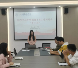 为了进一步加强辅导员队伍建设,提高辅导员职业素质能力,更高效调动学生参与班会的积极性,艺术设计学院于10月26日下午2:00在艺术楼205教室组织了第三期辅导员工作研讨会,学院党委书记冯琼芳,副书记黄超群,学工办副主任蔡子威以及各位专职辅导员参加了此次活动。本次主题班会由张芬芬老师进行讲解。