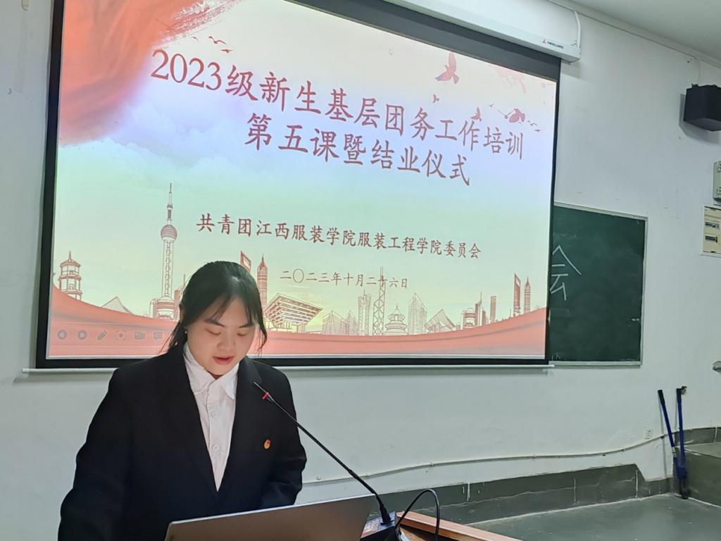 (服装工程学院讯 胥悦露/刘越溪撰稿)为进一步加深服装工程学院青年学子对共青团工作的认知,更好地开展团务工作,11月1日晚6:30,服装工程学院在主教楼-110教室举办了2023级新生基层团务工作培训第五课暨结业仪式,参加本次培训的有学院分团委学生副书记蒲悦、蔡依帆,分团委组织部、宣传部全体人员,2023级各班级团支部书记、团支部副书记、宣传委员、组织委员,本次培训的主讲人是学院分团委学生副书记蒲悦。