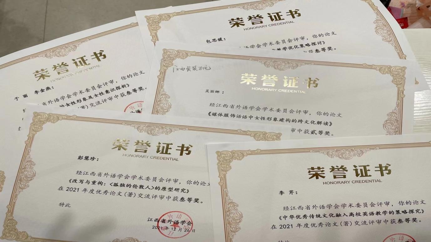 江西省外语学会会长况新华教授对此次外语学会所组织的论文(著)评审作了汇报。人文学院外语教研室李芹、于丽、李金燕、包思媛、彭慧珍老师的论文分别荣获三等奖。