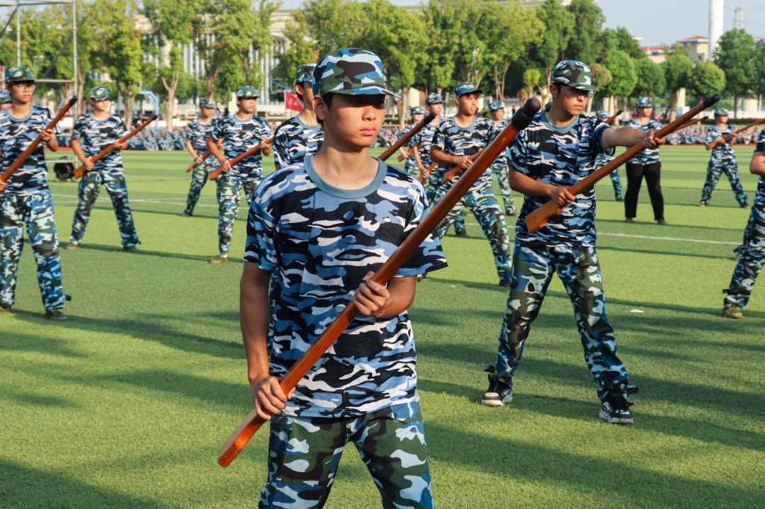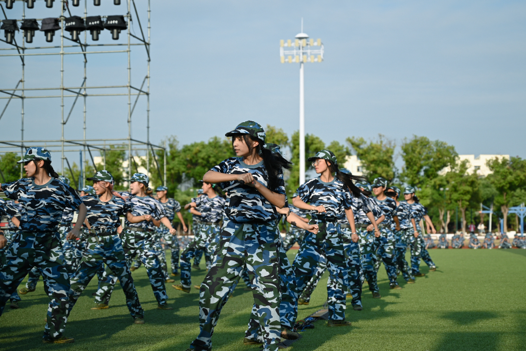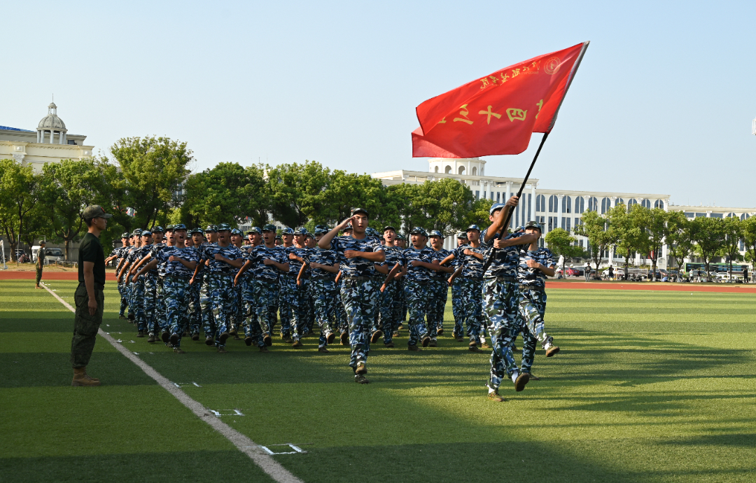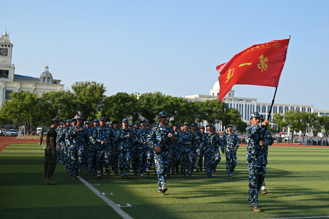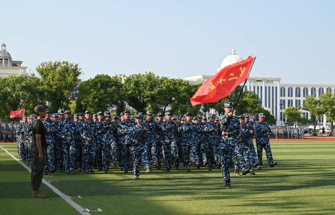 汇演总指挥教官整理好队伍后,面向主席台报告,学校领导指示:“按计划进行!”随着教官一声令下,现场气氛瞬间点燃。2024级参训新生依次进行分列式队列、擒敌拳、刺杀操、匕首操军事项目表演。
