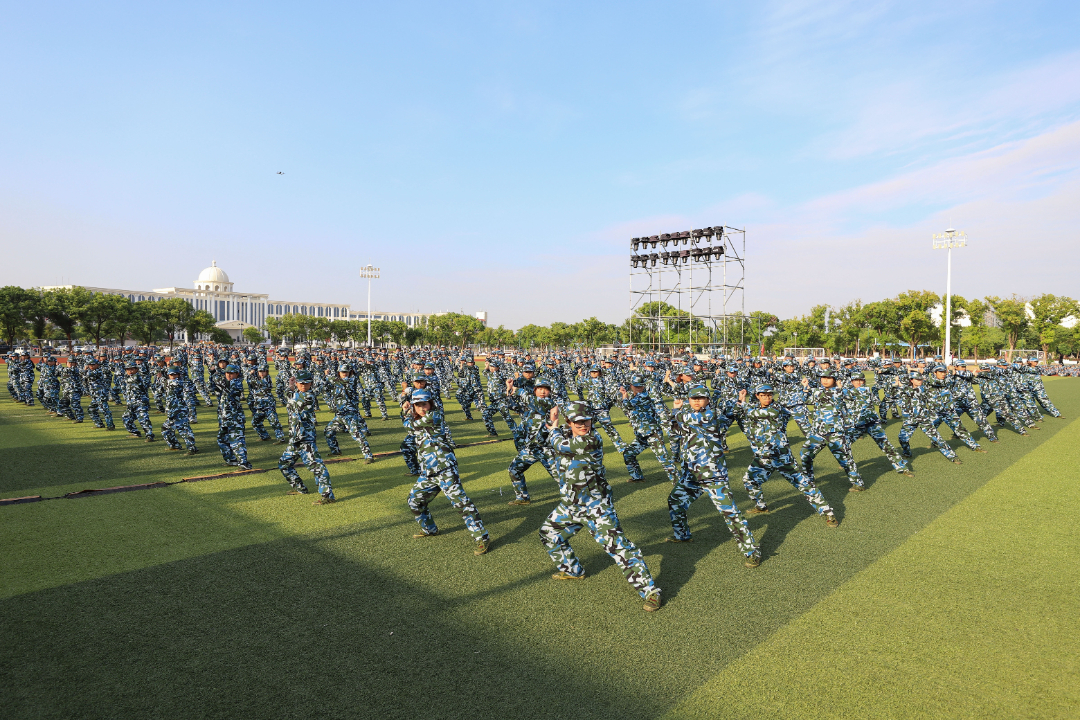 哨声响起,各分列式方队有条不紊地散开、组合,以高昂的士气、铿锵的步伐展示训练成果;擒敌操方块阵出招迅速、攻防兼备,动作刚柔并济,一招一式有来有往;匕首操方块阵动作干脆利落,一套出鞘、弓步、上刺、侧刺等连招势如破竹;刺杀操方块阵步伐一致,动作干净利落,随指挥员一声令下,吼声如雷贯耳,震人心魄。
