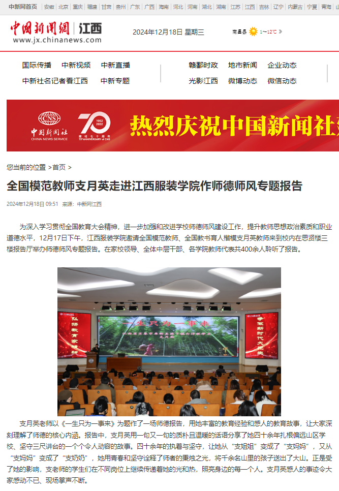 中国新闻网:全国模范教师支月英走进万象城平台作师德师风专题报告