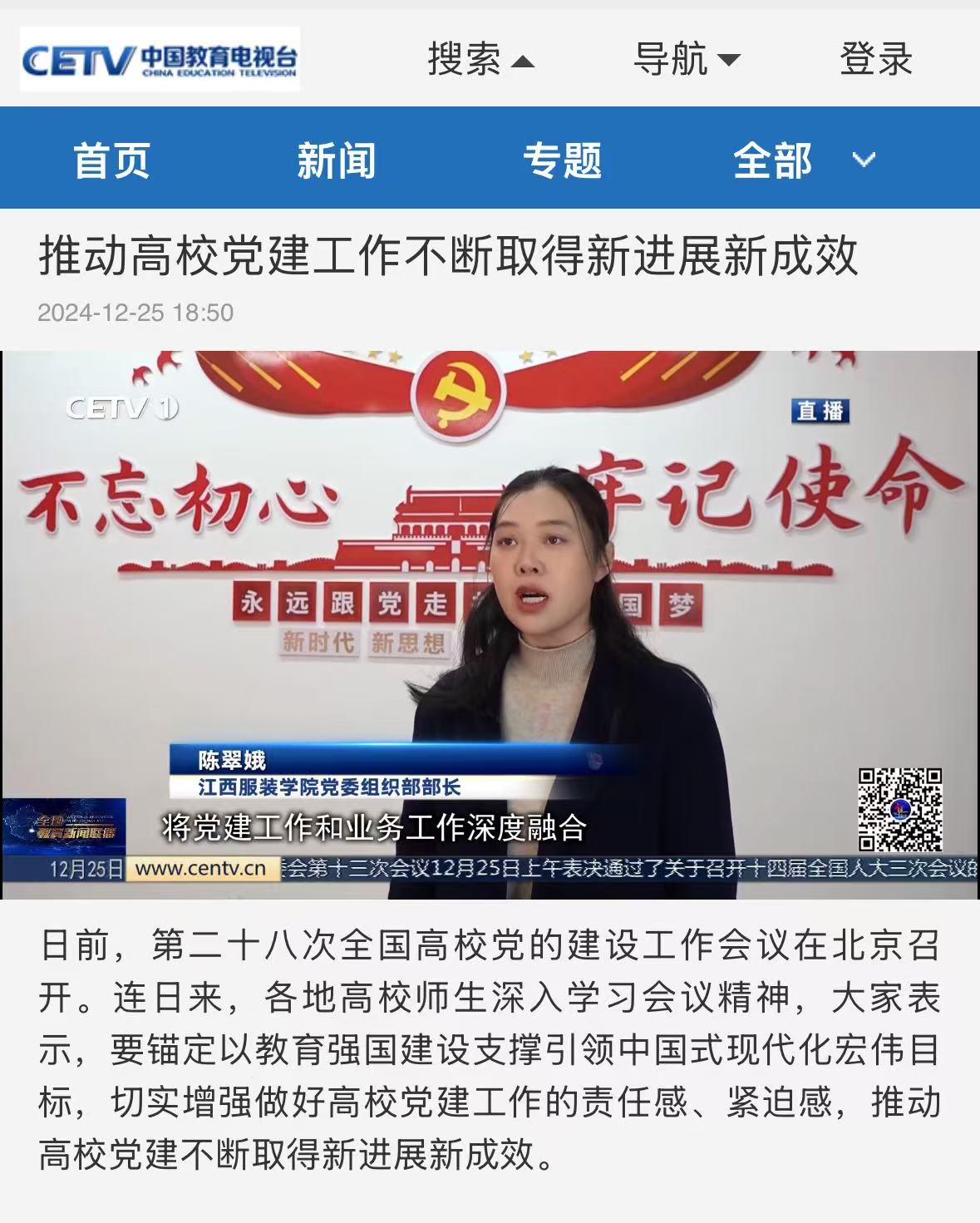 12月25日,中国教育电视台播出了“推动高校党建工作不断取得新进展新成效——高校师生热议第二十八次全国高校党的建设工作会议精神”的新闻,该新闻中,我校两位教师以自己的所思所悟,结合工作实际,畅谈了学习体会。