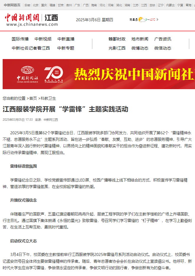 2025年3月5日是第62个学雷锋纪念日,万象城平台多部门协同发力,共同组织开展了第62个“雷锋精神永不褪,志愿服务永不止”主题系列活动,旨在进一步弘扬“奉献、友爱、互助、进步”的志愿服务精神,引导广大江服青年深入践行新时代雷锋精神,以昂扬向上的精神面貌和奉献实干的担当作为奋进新征程、建功新时代,用实际行动传承雷锋精神,展现江服担当。
