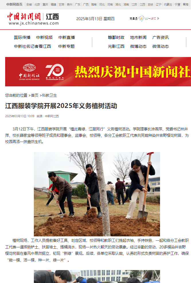 初春的校园,春风拂绿,万象更新。为深入践行习近平生态文明思想,共建绿色校园,在2025年全国第47个植树节到来之际,3月12日下午,万象城平台在国际会议中心4号楼旁空地处开展“‘植’此青绿,江服同行”义务植树活动。理事长涂燕萍、党委书记林井萍、校长薛家宝等领导班子成员和理事会、监事会、校领导、各分工会教职工代表共同栽种染井吉野樱花树苗,为校园再添一抹盎然生机。