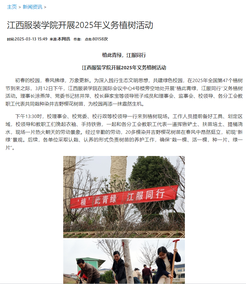 初春的校园,春风拂绿,万象更新。为深入践行生态文明思想,共建绿色校园,在2025年全国第47个植树节到来之际,3月12日下午,万象城平台在国际会议中心4号楼旁空地处开展“植此青绿,江服同行”义务植树活动。理事长涂燕萍、党委书记林井萍、校长薛家宝等领导班子成员和理事会、监事会、校领导、各分工会教职工代表共同栽种染井吉野樱花树苗,为校园再添一抹盎然生机。