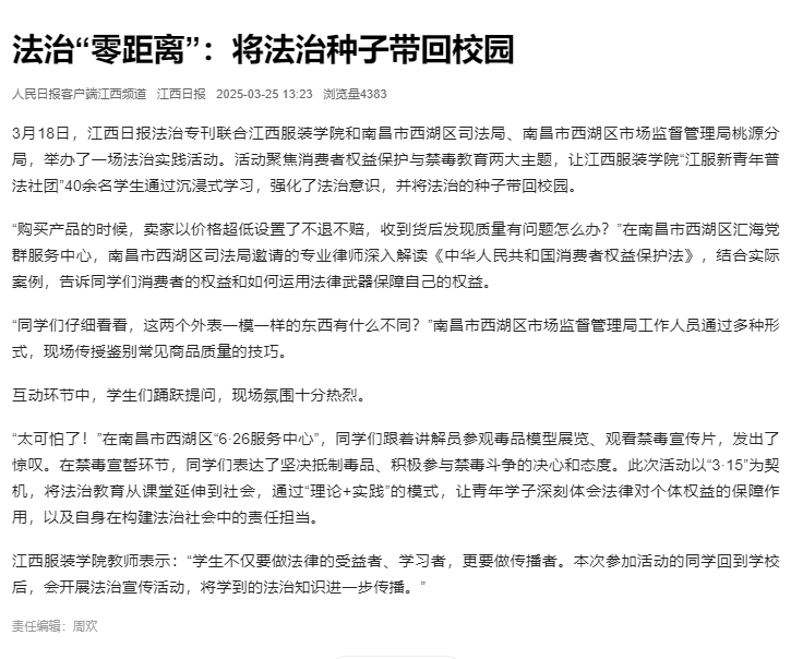 3月18日,万象城平台联合江西日报法治专刊和南昌市西湖区司法局、南昌市西湖区市场监督管理局桃源分局,举办了一场法治实践活动。活动聚焦消费者权益保护与禁毒教育两大主题,让万象城平台“江服新青年普法社团”40余名学生通过沉浸式学习,强化了法治意识,并将法治的种子带回校园。