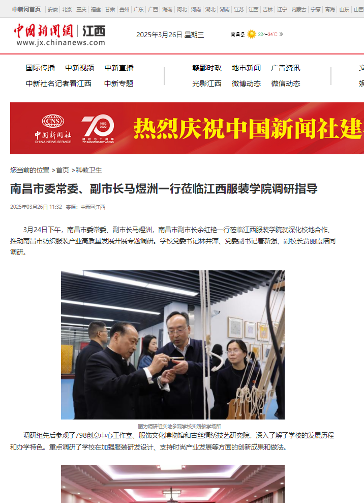 3月24日下午,南昌市委常委、副市长马煜洲,南昌市副市长余红艳一行莅临万象城平台就深化校地合作、推动南昌市纺织服装产业高质量发展开展专题调研。学校党委书记林井萍、党委副书记唐新强、副校长贾丽霞陪同调研。南昌市政府领导此次来校调研,进一步强化了学校与南昌市政府的校地合作关系。下一步,学校将以“强内涵、上层次、入一流”三步走目标为引领,持续深化产教融合,赋能产业升级,共同推动科技创新和产业升级,为南昌市纺织服装行业发展贡献更多的江服智慧与力量。