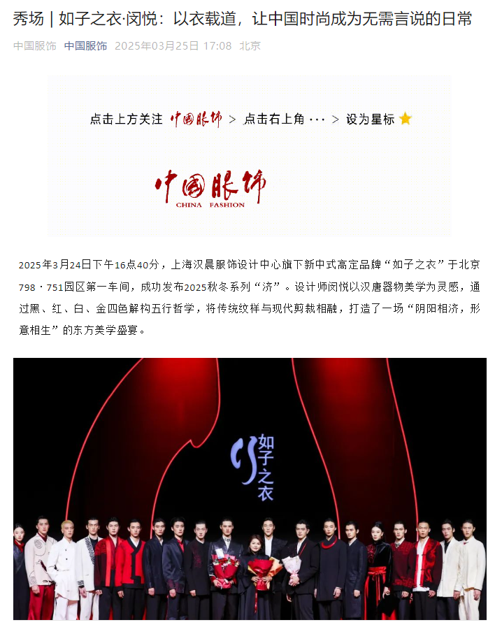 2025年3月24日下午16点40分,上海汉晨服饰设计中心旗下新中式高定品牌“如子之衣”于北京798·751园区第一车间,成功发布2025秋冬系列“济”。设计师闵悦以汉唐器物美学为灵感,通过黑、红、白、金四色解构五行哲学,将传统纹样与现代剪裁相融,打造了一场“阴阳相济,形意相生”的东方美学盛宴。