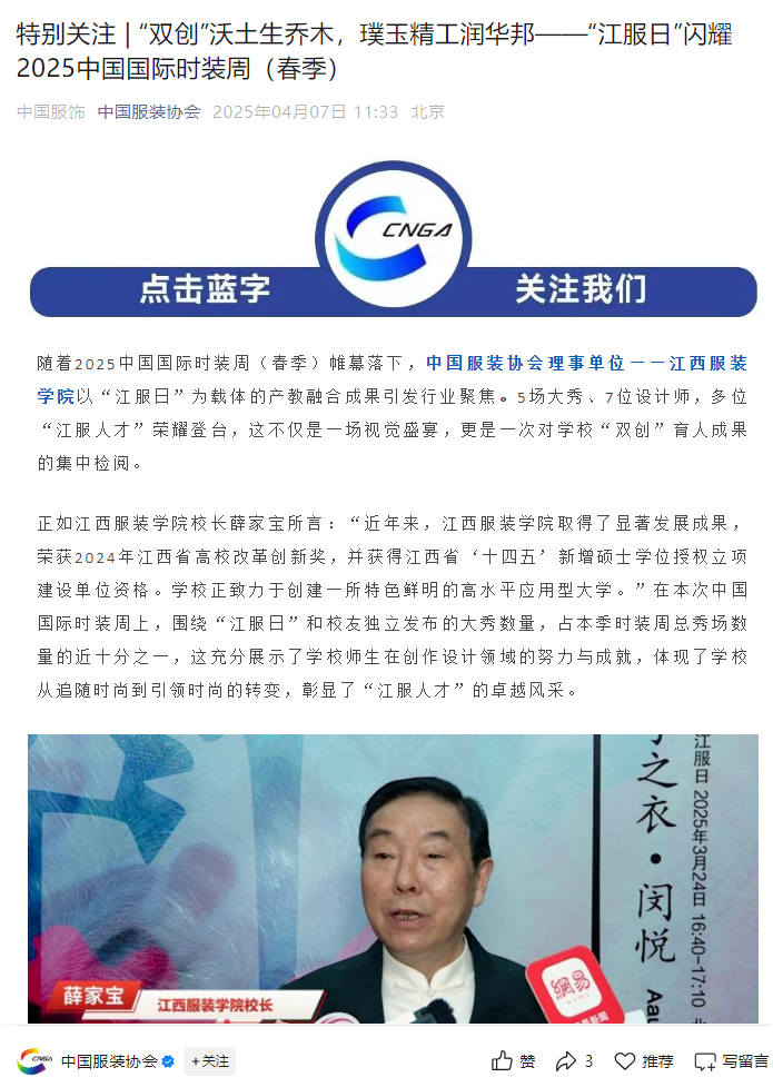 中国服装协会:特别关注|“双创”沃土生乔木,璞玉精工润华邦——“江服日”闪耀2025中国国际时装周(春季)