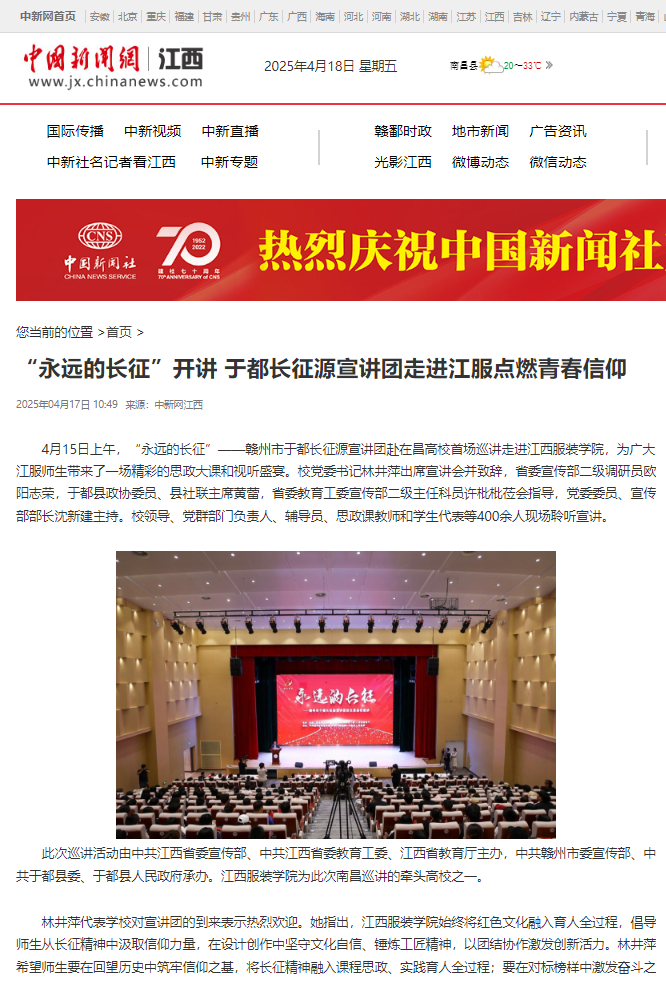 中国新闻网:“永远的长征”开讲 于都长征源宣讲团走进江服点燃青春信仰