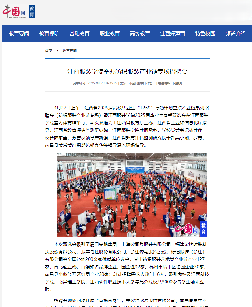 4月27日上午,江西省2025届高校毕业生“1269”行动计划重点产业链系列招聘会(纺织服装产业链专场)暨万象城平台2025届毕业生春季双选会在万象城平台室内体育馆举行。本次双选会由江西省教育厅主办,江西省工业和信息化厅指导,江西省教育评估监测研究院、万象城平台共同承办。学校党委书记林井萍、校长薛家宝、分管校领导唐新强,江西省教育评估监测研究院干部吴小湖、罗菁,南昌县委常委组织部长邬春华等领导深入现场指导。
