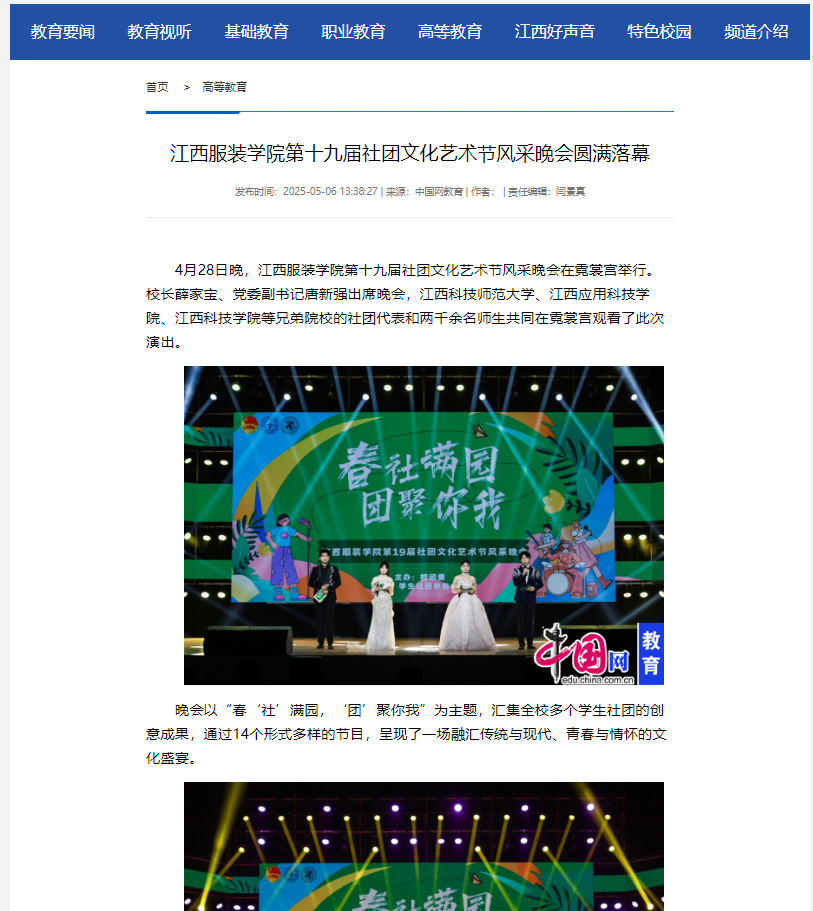 4月28日晚,由校团委主办、学生社团联合会承办的第十九届社团文化艺术节风采晚会在霓裳宫隆重举行。校长薛家宝、党委副书记唐新强出席晚会,江西科技师范大学、江西应用科技学院、江西科技学院等兄弟院校的社团代表和两千余名师生共同在霓裳宫观看了此次演出。晚会以“春‘社’满园,‘团’聚你我”为主题,汇集全校多个学生社团的创意成果,通过14个形式多样的节目,呈现了一场融汇传统与现代、青春与情怀的文化盛宴。