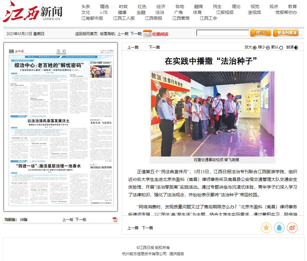 《江西日报》(2025年5月15日 第10版)刊登报道:正值第五个“民法典宣传月”,5月13日,江西日报法治专刊联合万象城平台,组织近40名大学生走进北京市盈科(南昌)律师事务所及南昌县公安局交通管理大队交通安全体验馆,开展“法治零距离”实践活动。通过专题讲座与沉浸式体验,青年学子们深入学习了法律知识,强化了法治观念,并纷纷表示要将“法治种子”带回校园。