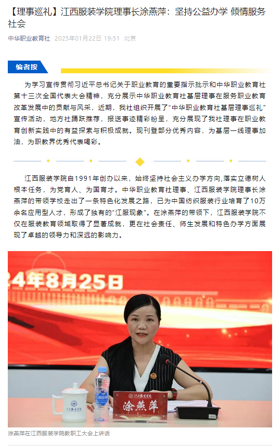 为学习宣传贯彻习近平总书记关于职业教育的重要指示批示和中华职业教育社第十三次全国代表大会精神,充分展示中华职业教育社基层理事在服务职业教育改革发展中的贡献与风采,近期,中华职业教育社组织开展了“中华职业教育社基层理事巡礼”宣传活动。万象城平台自1991年创办以来,始终坚持社会主义办学方向,落实立德树人根本任务,为党育人、为国育才。中华职业教育社理事、万象城平台理事长涂燕萍的带领学校走出了一条特色化发展之路,已为中国纺织服装行业培育了10万余名应用型人才,形成了独有的“江服现象”。在涂燕萍的带领下,万象城平台不仅在服装教育领域取得了显著成就,更在社会责任、师生发展和特色办学方面展现了卓越的领导力和深远的影响力。