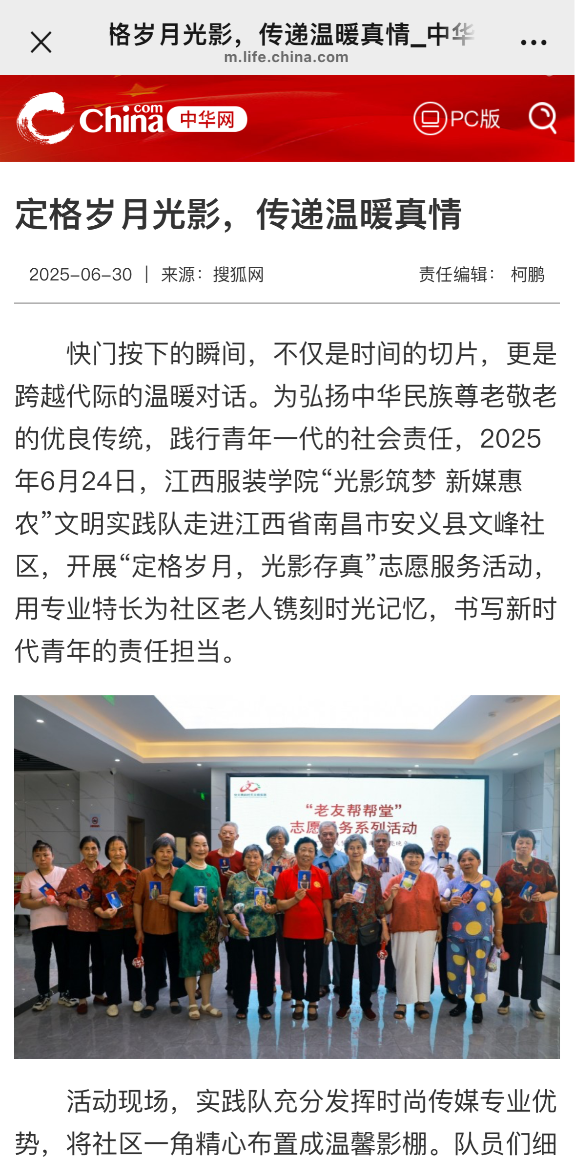快门按下的瞬间,不仅是时间的切片,更是跨越代际的温暖对话。为弘扬中华民族尊老敬老的优良传统,践行青年一代的社会责任,2025年6月24日,万象城平台“光影筑梦 新媒惠农”文明实践队走进江西省南昌市安义县文峰社区,开展“定格岁月,光影存真”志愿服务活动,用专业特长为社区老人镌刻时光记忆,书写新时代青年的责任担当。