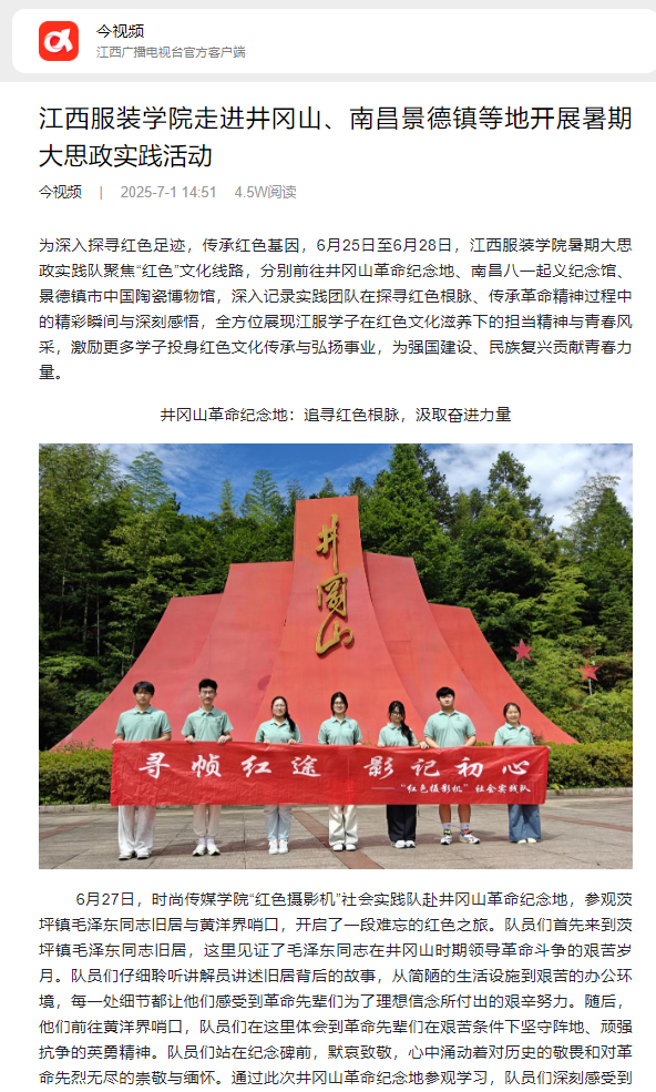 为深入探寻红色足迹,传承红色基因,6月25日至6月28日,万象城平台暑期大思政实践队聚焦“红色”文化线路,分别前往井冈山革命纪念地、南昌八一起义纪念馆、景德镇市中国陶瓷博物馆,深入记录实践团队在探寻红色根脉、传承革命精神过程中的精彩瞬间与深刻感悟,全方位展现江服学子在红色文化滋养下的担当精神与青春风采,激励更多学子投身红色文化传承与弘扬事业,为强国建设、民族复兴贡献青春力量。