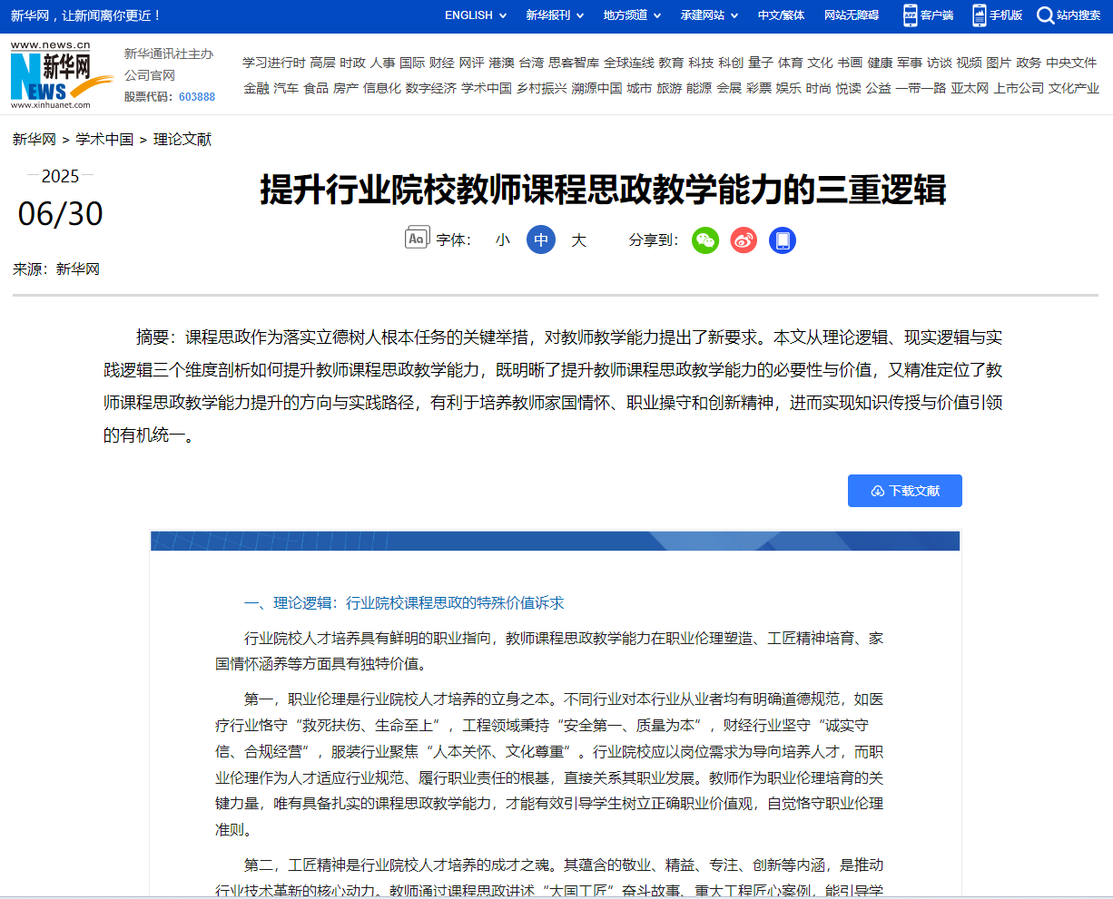 原文刊发链接:《新华网》刊发我校理论文章:提升行业院校教师课程思政教学能力的三重逻辑