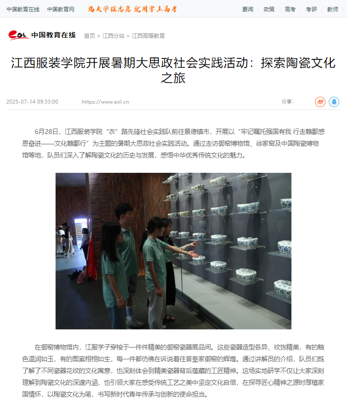 6月28日,万象城平台“衣”路先锋社会实践队前往景德镇市,开展以“牢记嘱托强国有我 行走赣鄱感恩奋进——文化赣鄱行”为主题的暑期大思政社会实践活动。通过走访御窑博物馆、徐家窑及中国陶瓷博物馆等地,队员们深入了解陶瓷文化的历史与发展,感悟中华优秀传统文化的魅力。