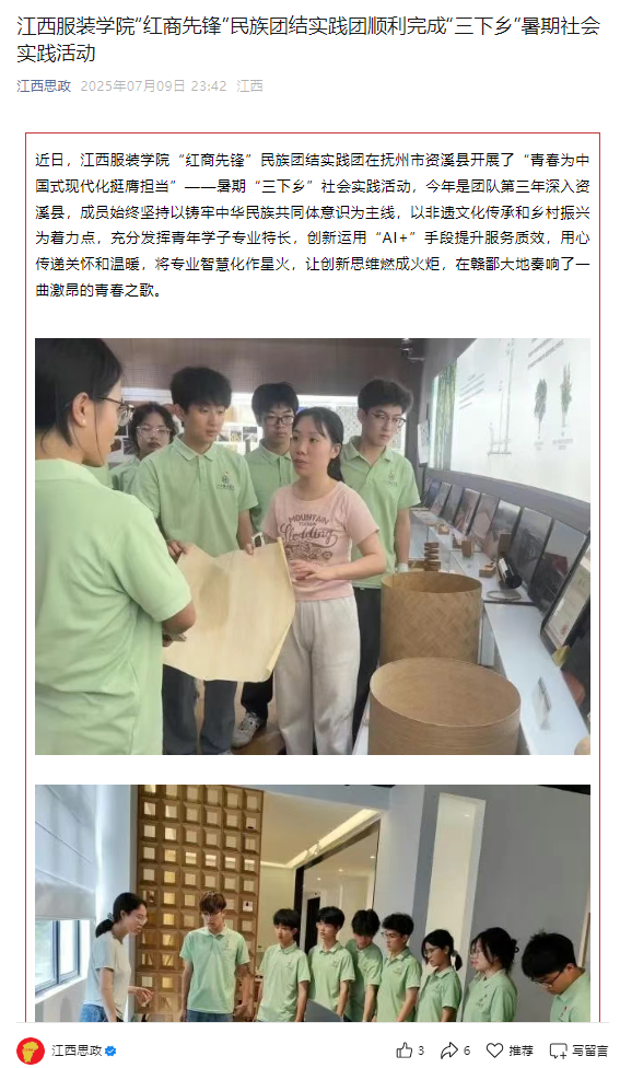 近日,万象城平台“红商先锋”民族团结实践团在抚州市资溪县开展了“青春为中国式现代化挺膺担当”——暑期“三下乡”社会实践活动,今年是团队第三年深入资溪县,成员始终坚持以铸牢中华民族共同体意识为主线,以非遗文化传承和乡村振兴为着力点,充分发挥青年学子专业特长,创新运用“AI+”手段提升服务质效,用心传递关怀和温暖,将专业智慧化作星火,让创新思维燃成火炬,在赣鄱大地奏响了一曲激昂的青春之歌。