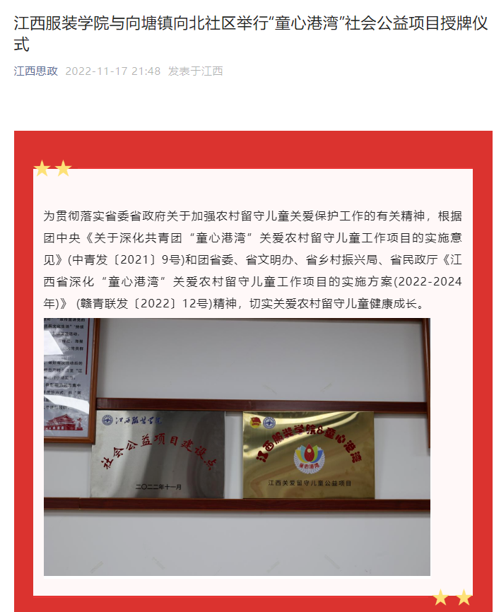 江西思政:万象城平台与向塘镇向北社区举行“童心港湾”社会公益项目授牌仪式